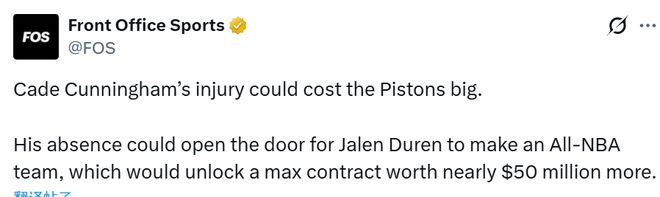 目前活塞穩居東部第一。此前休賽期,活塞本有機會提前續約杜倫。當時杜倫索要年薪超3000萬美元,雙方談判破裂,杜倫今夏成為受限自由球員。誰也沒想到,杜倫本賽季迎來爆發,入選全明星,還是最快進步球員的最大熱門。分析師指出:只有活塞,能給杜倫開出30%工資帽的頂薪;其他球隊最多只能開出25%的頂薪。