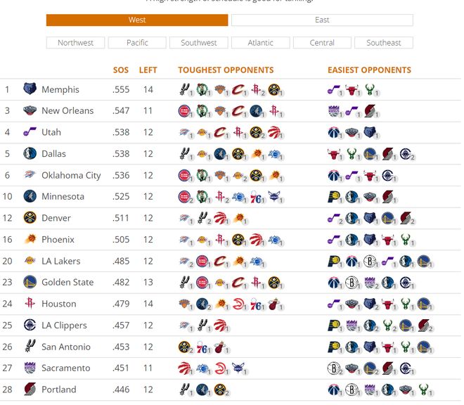 不過快船還手握一個優勢,那就是快船余下的賽程是聯盟第五優質的,對手的平均勝率僅為45.7%,還剩三場季后賽內的球隊:雷霆、馬刺、猛龍。