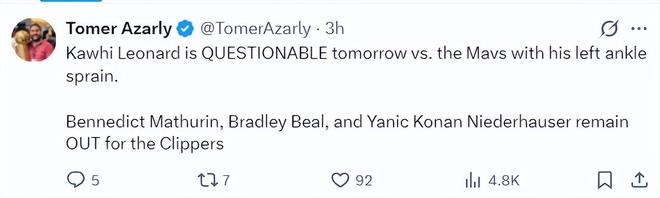 根據快船記者Tomer Azarly的報道,對陣獨行俠的比賽倫納德是出戰存疑,他的左腳踝扭傷了。馬瑟林、尼德豪澤兩人確定缺席對陣獨行俠,快船遭遇一波傷病潮。(馬瑟林腳趾傷勢、尼德豪澤右腳韌帶損傷)