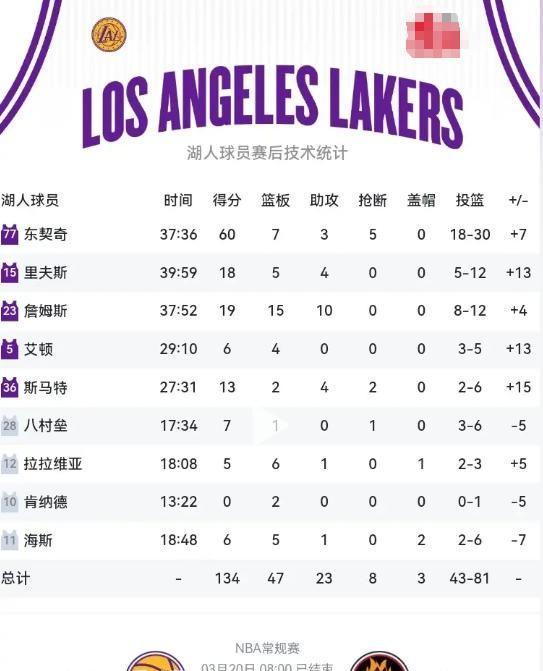 這60分不僅刷新其加盟湖人后的個人單場得分紀錄,更締造背靠背兩戰合計斬獲100分的隊史新里程碑,成為湖人隊史首位達成此項成就的球員;末節獨攬20分的統治級輸出,則如利刃直插對手心臟,徹底鎖定勝局。