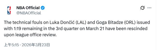 北京時間3月23日,NBA官方宣布,經(jīng)過復(fù)核,3月22日第三節(jié)剩余1分19秒時,判給湖人的東契奇與魔術(shù)的比塔澤的技術(shù)犯規(guī)已正式撤銷。這也意味著東契奇的第16次技犯已經(jīng)撤銷,他將不會在周二對陣活塞的比賽中被禁賽。