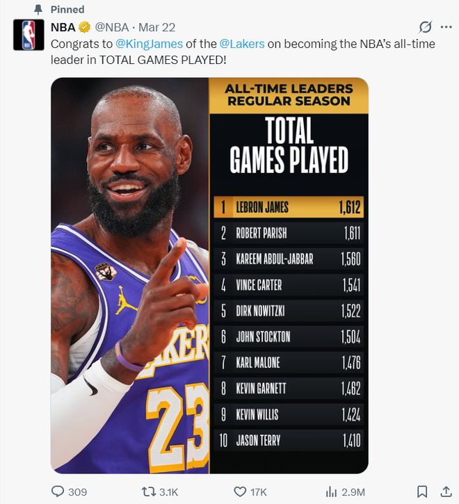 3月22日勒布朗完成1612場(chǎng)后NBA官方就將這項(xiàng)海報(bào)置頂了,歷史前十登場(chǎng)數(shù)里只有勒布朗一人是現(xiàn)役球員。