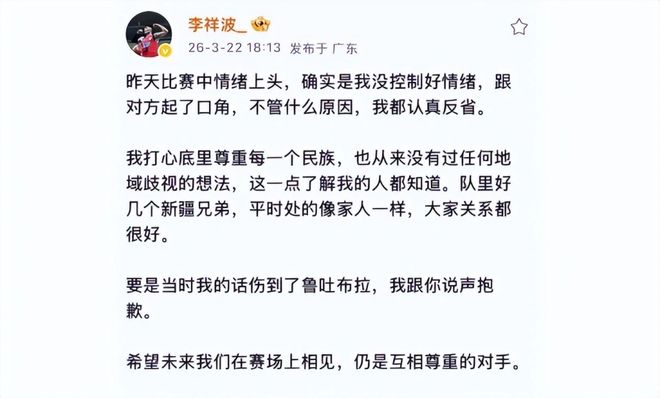 在意識(shí)到事情的嚴(yán)重性后,李祥波也是在網(wǎng)上發(fā)聲進(jìn)行了公開道歉:“我打心底里尊重每一個(gè)民族,也從來(lái)沒(méi)有過(guò)任何地域歧視的想法。”“要是當(dāng)時(shí)我的話傷到了魯吐布拉,我跟你說(shuō)聲抱歉”。
