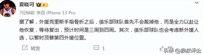 北京時間3月22日,根據媒體人“夏曉司”報道,外援克里斯手指骨折之后,俱樂部球隊首先不會裁掉他,而是全力以赴讓他恢復,等待復出,預計時間是三周到四周。其次,俱樂部球隊也會考慮新外援人選,以暫時頂替第四外援位置。