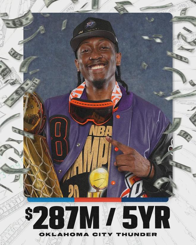 2025年夏天,雷霆5年2.39億美元續約杰倫-威廉姆斯。如果他在本賽季入選最佳陣容,哪怕是三陣,這份合同都將變成5年2.87億美元。可惜杰威被右腿筋傷勢長期困擾,不僅個人數據下滑,出勤率也不夠,他跟切特一樣拿5年2.39億。