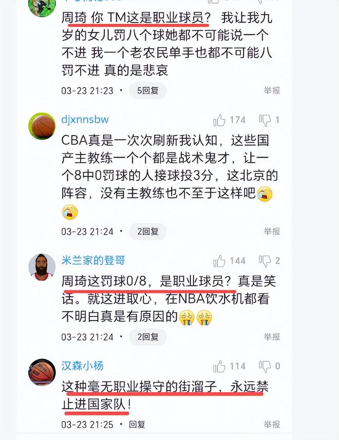 球迷怒批周琦毫不中用,“八罰零中,這是人干的事嗎???這是你的職業(yè)啊,以前還能投三分,現(xiàn)在一點(diǎn)籃子都沒有了,說白了就是缺練”、“周琦你這是職業(yè)球員?我讓我九歲的女兒罰八個(gè)球她都不可能說一個(gè)不進(jìn) 我一個(gè)老農(nóng)民單手也都不可能八罰不進(jìn)真的是悲哀”。球迷批他缺少職業(yè)精神,是個(gè)街溜子,完全是混日子。否則,他也不會(huì)8罰0中。對(duì)此,你如何評(píng)價(jià)周琦?