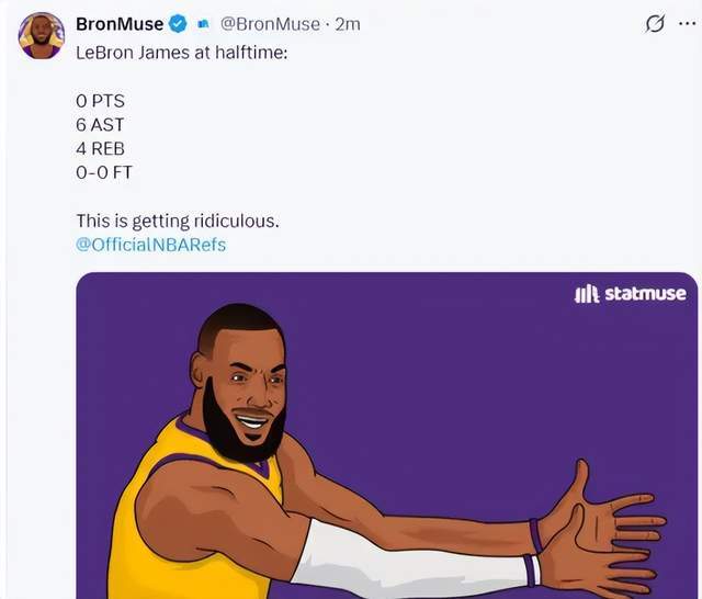 先從上半場來看,如果只看數據,詹姆斯基本沒有多少存在感。出戰18分鐘,5投0中,數據包上0分4籃板6助攻。對于詹姆斯而言,這種畫面屬實少見。