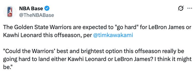 北京時(shí)間3月29日,據(jù)勇士隊(duì)記Tim Kawakami報(bào)道,出于不同原因,萊昂納德或詹姆斯今年夏天都有可能接受非頂薪合同加盟,且勇士無需付出任何交易籌碼。勇士有望得到一位未來名人堂成員,為庫里時(shí)代畫上圓滿句號(hào)。