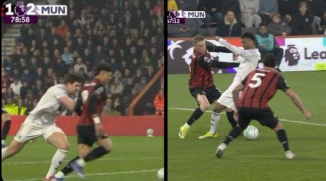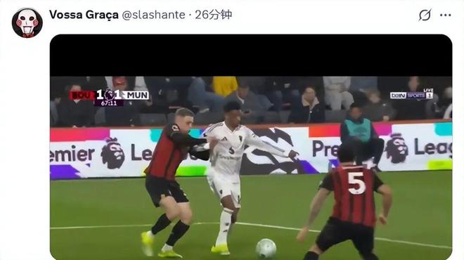 比賽進程因第67分鐘的一次判罰徹底轉向。當時曼聯(lián)1-0領先,阿瑪?shù)陆麉^(qū)內突破被特呂費爾推倒,主裁沒有任何表示。伯恩茅斯順勢反擊,由克里斯蒂低射扳平比分。VAR介入后認定進球有效。